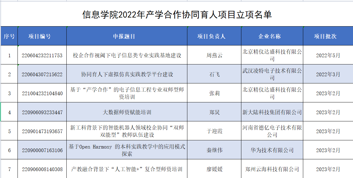 近日,教育部高等教育司发布了《关于公布2022年第二批产学合作协同育人项目立项名单的通知》(教高司函〔2023〕1号),biwn必赢网址信息科学与工程学院获批5项教育部2022年第二批产学合作协同育人项目。至此,学院2022年教育部产学合作协同育人项目立项数达7项,获批数量创历史新高。